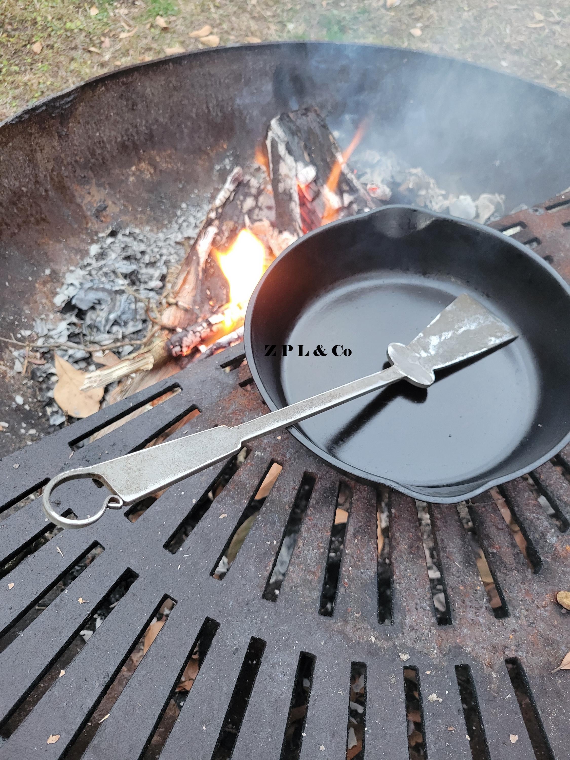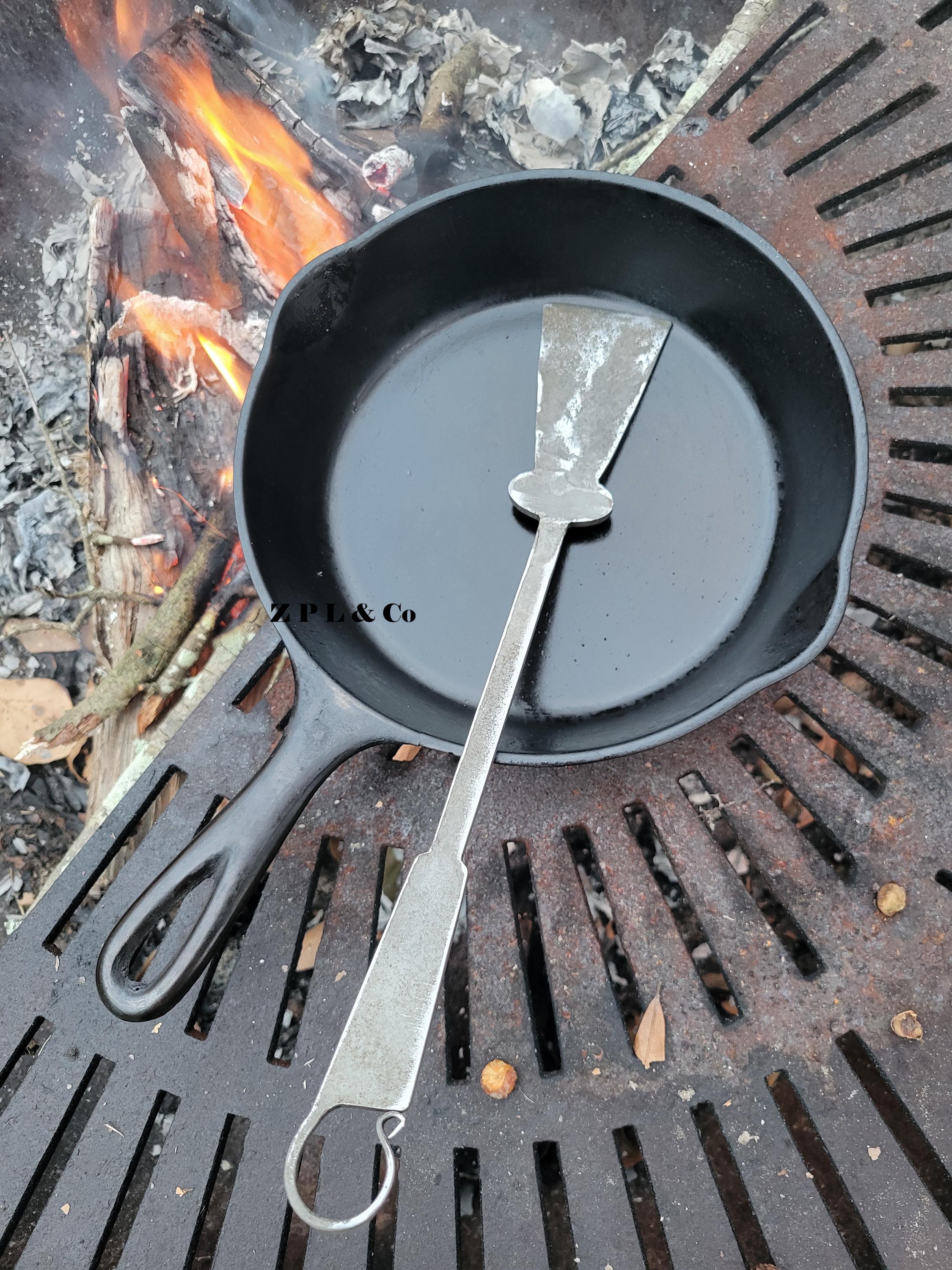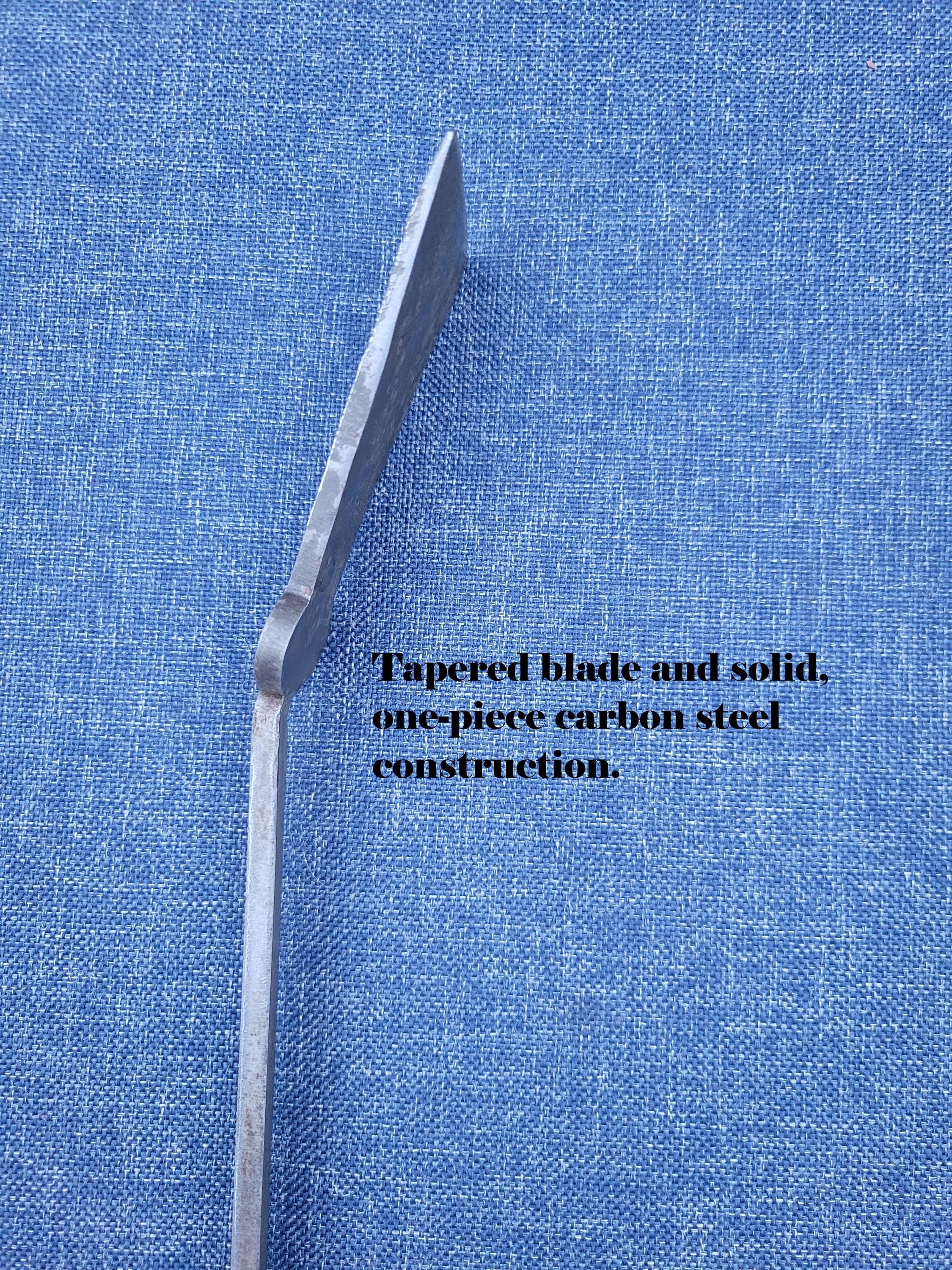 Forged from solid steel and made in small batches in the USA, each spatula reflects the simple, utilitarian beauty of early American craftsmanship. The distinctive keyhole-shaped end, measuring approximately 2 inches wide by 3 inches long, is both practical and true to period form, offering excellent control and durability.